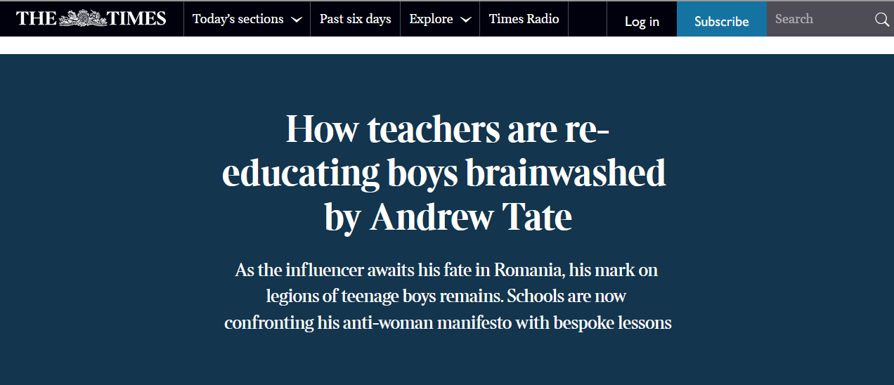 What has Tate got to do with UK education, except perhaps as a telling symbol of its unintended consequences? Why not just model and enforce ideals such as courtesy, self-restraint, and hard work, while upholding high academic standards? The article demonstrates how deeply committed schools have become to ideological programming. Some schools have drawn up “entire lessons focused on Tate” (!!!) while others deal more generally with “misogyny and gender stereotypes.” Whatever the particulars, the general message is unvarying: “We’ve all got to work collaboratively and collectively to support young men to reframe masculinity—away from this toxic ideology that’s presented by the likes of Tate.”