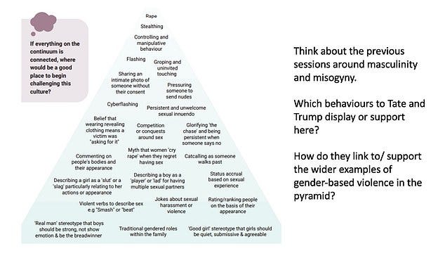 The crowning glory is perhaps the rape culture pyramid (above), which itemizes beliefs and practices that allegedly promote sexual violence. These include “traditional gendered roles within the family,” “jokes about sexual harassment or violence” and “describing a girl as a slut or slag.” A discussion question asks, “If everything on the continuum is connected, where would be a good place to begin challenging this culture?” and, almost incredibly, “Which behaviors do Tate and Trump display or support here?” According to classical conceptions of rhetoric and logic, both questions are fallacious in assuming answers allegedly sought (they assume, for example, that everything in the pyramid is connected to rape; and that there is something called rape culture that Tate and Trump promote).