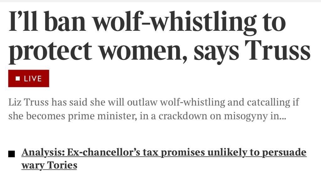The particular subject was legislation that has been proposed by two of Prime Minister Boris Johnson’s potential replacements to criminalize cat-calling, wolf-whistling, and “down-blousing” (photographing a woman’s cleavage). Only Buchanan dared to say what should be evident to all sane people: that such legislation would be worse than useless, socially divisive, enormously insulting to men, and an instance of egregious state over-reach.