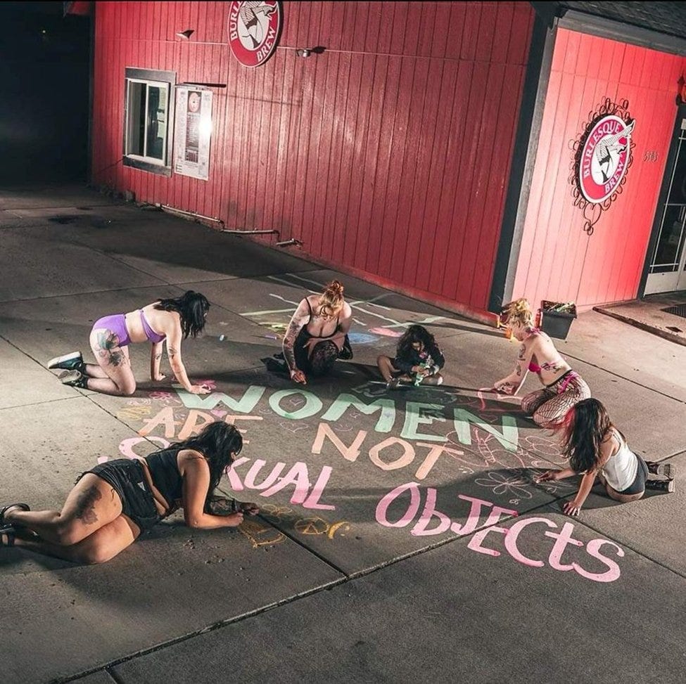 It has become common in feminist activism to declaim against the alleged objectification of women by mimicking such objectification without any evident irony. In one typical example, feminist advocates have written Women are not sexual objects in large colored chalk letters, while posing themselves writing it in precisely the way the mythical patriarchy might pose them if the objective were to present them as sexual objects, their breasts and tattooed limbs revealed by tight bikinis and short shorts, their hair tousled and cleavage gaping.
