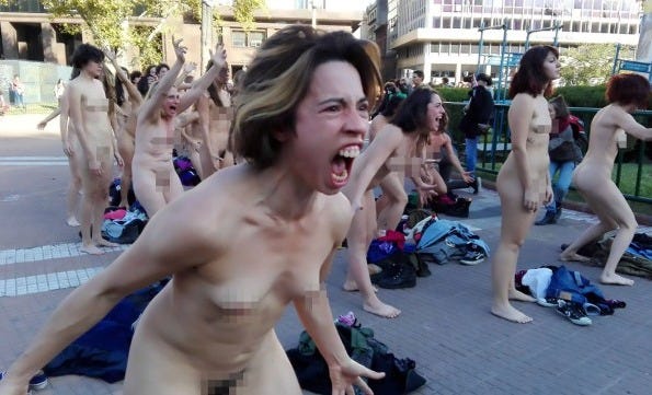 It is not at all unusual for feminist women staging some sort of protest—the cause doesn’t seem to matter—to expose their bodies for attention. “Hundreds of women strip naked to protest against sexual violence,” is a typical headline. In this case, Brazilian women were objecting to “claims by some that women provoke attacks by the way they dress or act.” Argentinian women mounted a naked, screaming objection to domestic violence (pictured at the top). British women stripped naked on video to protest the planned closure of a local hospital. The women of Extinction Rebellion are fond of topless protests, and during the George Floyd-inspired mayhem of 2020, a naked woman did revealing yoga poses in front of Portland riot police.