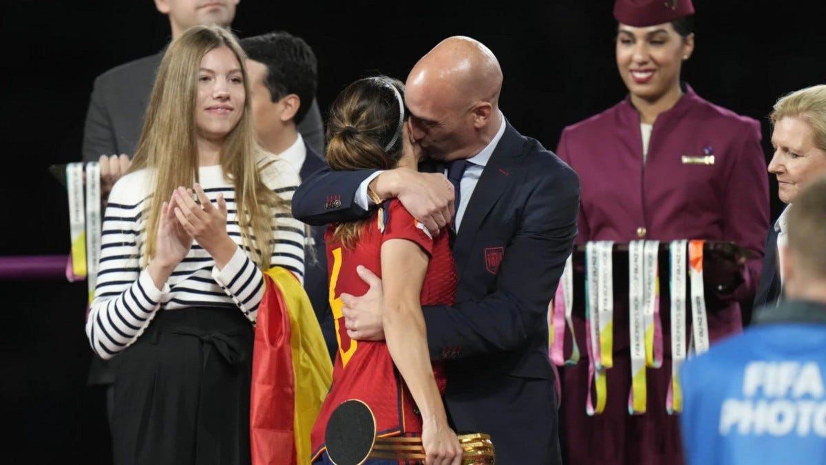 Feminist consensus gathered predictably around the Spanish Kiss imbroglio, in which Spanish footballer Jenni Hermoso filed a criminal complaint of sexual assault and forced the resignation of Luis Rubiales, president of the Spanish Football Federation following his unsolicited World Cup victory kiss.